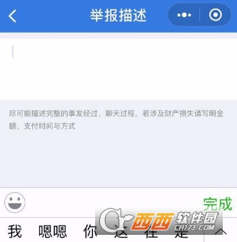 进入选择“举报描述”界面,在该界面可以输入文字尽可能完整地描述聊天过程,对于涉及财产损失的药品,填写清楚金额、支付时间、支付方式;