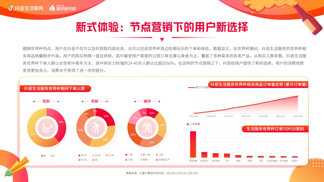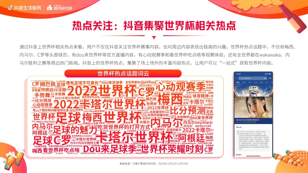 Tik Tok对这一世界级赛事的直播吸引了全国用户的关注。共有106亿人在平台上观看了世界杯,有13亿次互动。在这场盛宴中,用户、人才、媒体积极参与,尽情狂欢。用户参与度高,发布视频数量最多;达人视频吸引人,获得最大播放量;媒体发布的视频,单个世界杯视频平均86万次播放,是平台世界杯内容生态的重要组成部分。