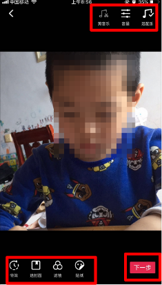 3、这样,进入编辑界面,设置配乐、特效、音量、贴纸等效果,就可以成功制作一个“专辑”视频了。有兴趣的朋友可以尝试一下。
