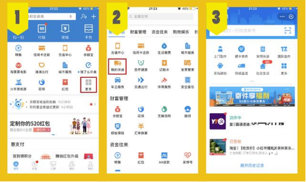 点击支付宝“首页-更多-便利生活-我的快递”: