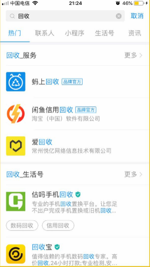 在支付宝首页搜索栏中输入关键词“回收”,会出现很多回收服务小程序: