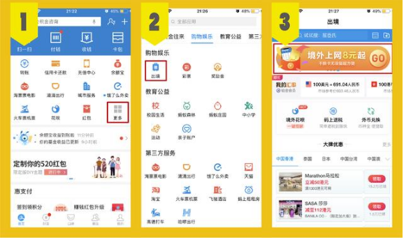 点击支付宝的“首页-更多-购物娱乐-出境”后,有“境外上网”: