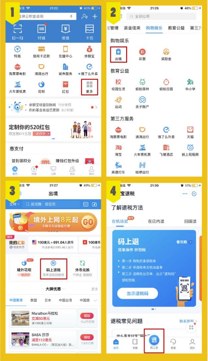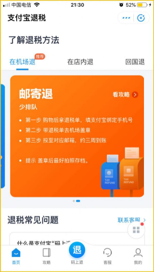点击支付宝“首页-更多-购物娱乐-出境-退税码”。支付宝退税有两种方式,“代码退税”和“邮寄退税”。