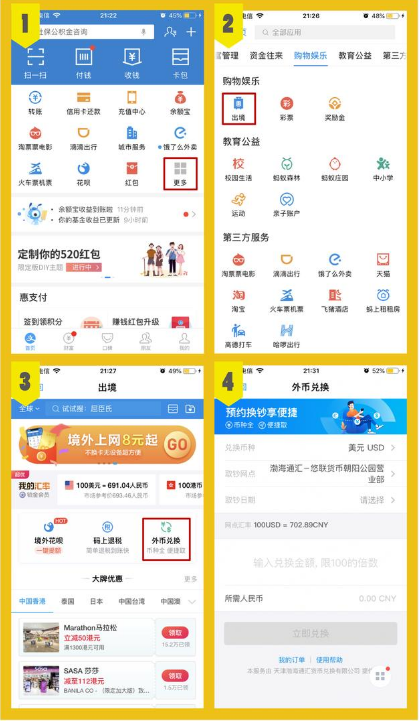 点击支付宝“首页-更多-购物娱乐-出境-外币兑换”: