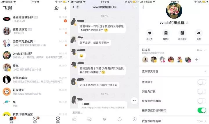 除了给好友添加联系人之外,“飞聊”还具有很高的可玩性。理想情况下,用户可以和特别亲密、愿意尝试新产品的朋友(通常是同龄的朋友)聊天;他们还可以发现并加入自己感兴趣的团体,寻找有共同兴趣的人;他们还可以关注自己最喜欢的明星、名人、意见领袖。