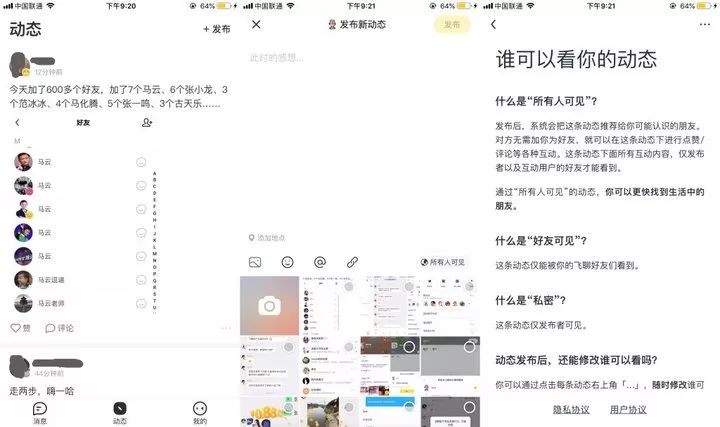 除了聊天之外,“飞聊”还鼓励用户发布“动态”。与微信朋友圈不同,“动态”支持“所有人都可以看到”的状态。系统会将所有人可见的动态推荐给发布者可能认识的所有好友,对方无需添加好友即可在动态中进行点赞、评论等互动。