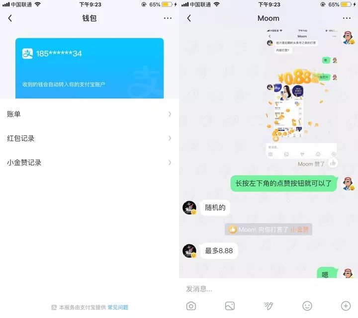 “飞聊”还拥有与支付宝合作的“钱包”功能。绑定支付宝后,用户可以发送或接收红包。在聊天界面,对于好友或群成员发送的图片和视频,用户还可以通过长按左下角的点赞按钮激活“小金点赞”,最高给聊天消息增值8.88元。