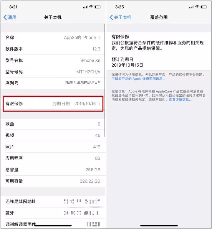 在iOS 12.3 中,苹果在“关于本机”——“有限保修”中添加了一条对用户非常有用的信息。