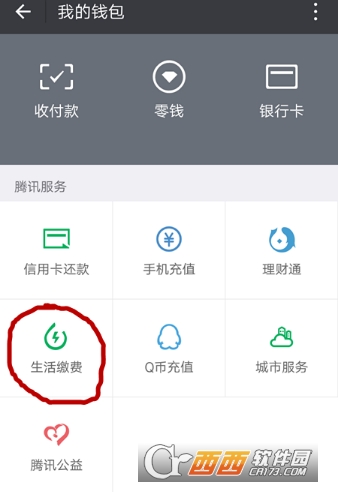 在“我的钱包”页面中,点击如图中红色标记的“终身支付”选项。里面有我们电费缴纳的内容。