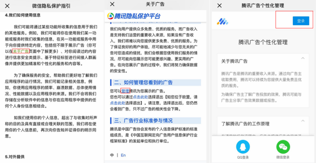 然后屏幕将直接跳转到所选章节。有一行不同颜色的小字,叫做“关于广告”。依然是被选中的。我们就可以开始下一步的操作了。在这个页面上,我们可以看到我们实际上可以管理这些广告。这时我们可以通过管理进入登录页面,然后开始关闭广告的操作。但有一点需要注意,因为我们是使用手机进行操作,而此时微信是登录的,所以我们只能选择QQ登录。