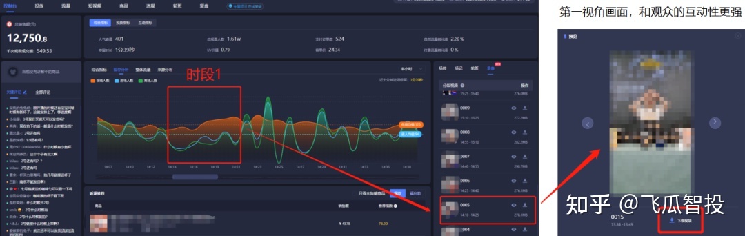 那么切片的材质如何选择呢?一般直播中会实时监控留存、转化等指标,选择数据好的时间段。比如接下来的第1期,直播间的留存率很高,可以在直播中用智投实时下载直播画面,制作切片视频。
