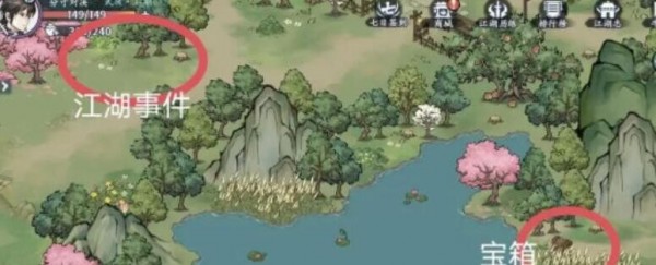 5,宝箱在中间,日常祭祀和藏宝图在树下,还有一个宝箱需要点击山洞才能触发剧情,山洞里也有一张藏宝图。