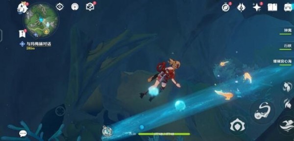 2.玩家从湖前潜到湖底,看到水柱和一个蓝色的球在水流中来回晃动。