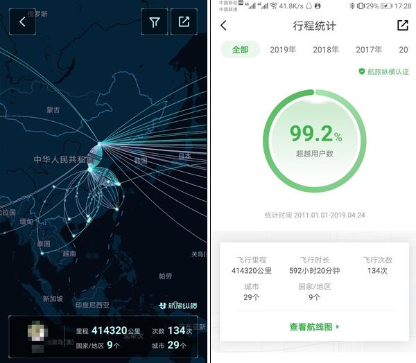 很多人喜欢分享的路线图、行程统计也换了样貌。前者界面更酷(中国到美国的航线终于正常了),后者则更详细。比如可以按照不同年份、航空公司、国家和城市、机场来划分。等待相关数据。