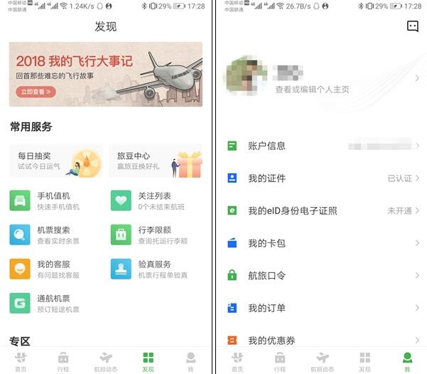 功能方面,首页当前行程信息展示更加直观,同时还智能推荐行程相关服务,如机场接送、延误猜测、航班点评等。发票行程针对机场接送进行了优化,还增加了旅行权益部分。