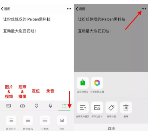 4.需要注意的是,在iOS版微信中,没有字体加粗功能,但有更多的拍摄功能。