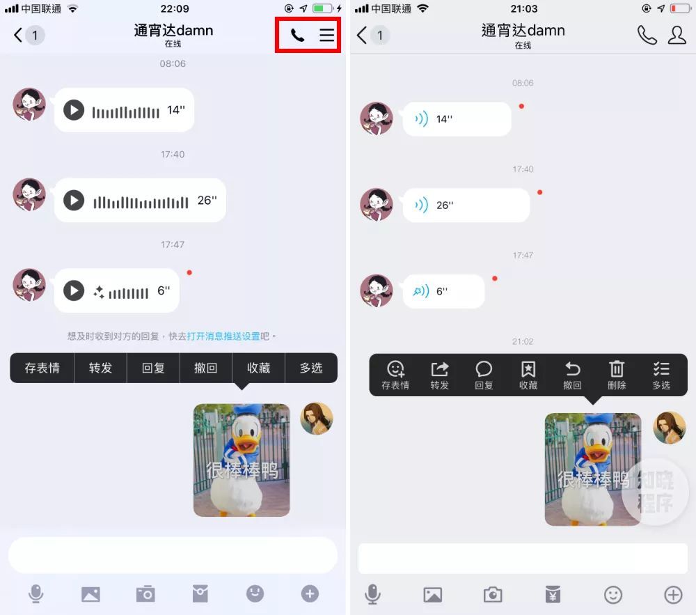 无论您使用对讲、录音或变声功能发送或接收语音信息,都支持以上效果。值得一提的是,通过“变声”发送的语音消息会被几颗小星星点缀。