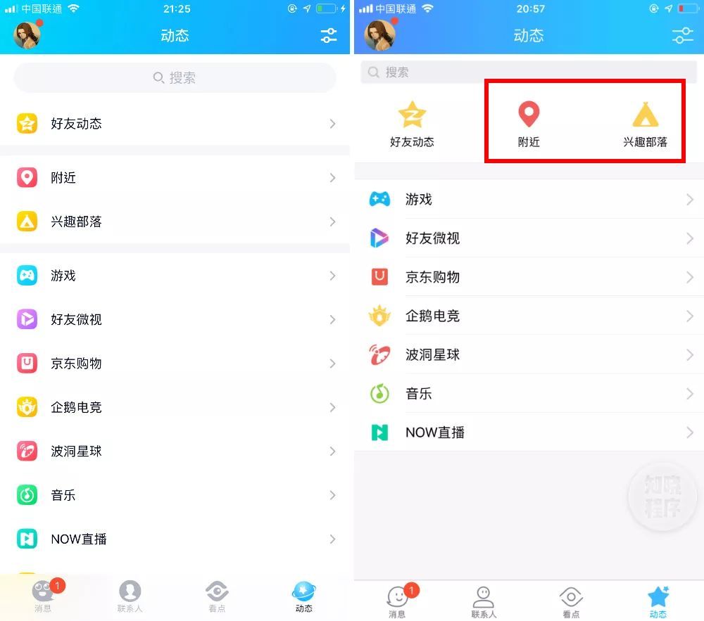 动态页面的改动应该会受到很多用户的喜欢。搜索输入框有圆角。在最新的动态页面设置中,除了“好友动态”之外,包括“附近”、“兴趣部落”等其他项目都可以设置隐藏。