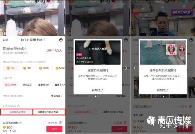 第三,就是DOU+的直播。2020年4月前,只能将视频内容放入直播DOU+进行直播引流。在随后的更新中,增加了“直热直播间”的展示形式。现在两种交付方式并存。(如图)