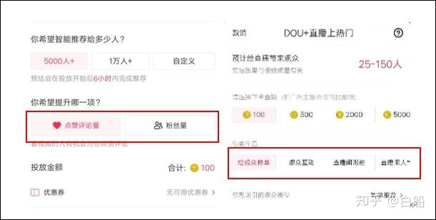 让我们用这种形式来计算客户获取成本。首先请参考DOU+系统提供的竞价预测效果。视频DOU+提供预计的播放次数,即CPM;直播的DOU+就是给直播带来的观看人数,也就是从推荐页面观看视频然后点击进入直播间的人数。这里给100元= 25-150人,即每个用户通过直播斗+进入直播间的成本在4元-0.67元之间(我们可以称之为“观看直播的成本”)。