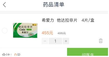 4、将药品添加到“药品清单”中,然后在“药品清单”界面点击界面右下角的“问医生”,跳转到信息输入,填写《药房门诊病历卡》 ”并选择患者,如果您已有信息,请填写调查问卷;