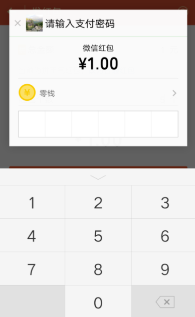 6.点击往红包里插钱,就像去了支付密码输入页面,如图。
