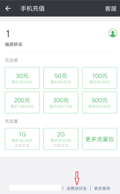 2.打开手机充值页面,找到话费,发给好友,如图。