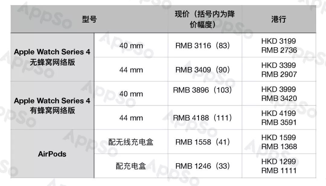 正如我们前面所说,降价与价格成正比,因此虽然价格最低的Apple Watch 和AirPods 也比之前便宜,但价差基本只有两位数。