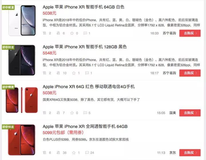 某知名导购平台搜集的今日各电商iPhone XR 优惠价格