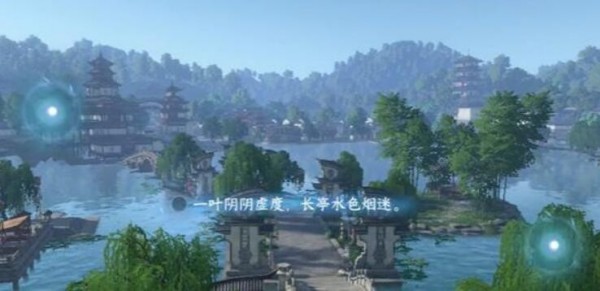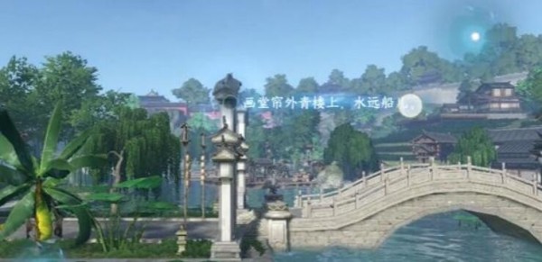 5.玩家顺着镜头的视线到断桥底部,用断桥下的船的形象写歌词。第四句画在帘外青楼,水远。