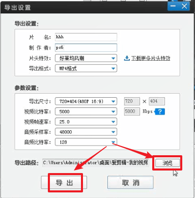 填写影片名称和制片人,点击【浏览选择导出位置】,点击【导出】保存视频。到