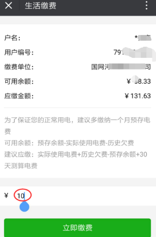 输入用户号,点击下一步,立即查询账单。可以看到用户信息和可用余额低于可用余额,可能会断电。如果有计算应付金额的参照,则自动带出应付金额。我将在下图中演示修改付款金额后的付款10元。
