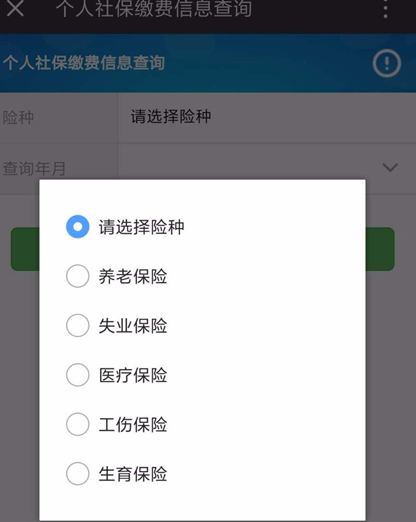 4.在“险种”中选择要查询的险种,如养老保险、失业保险、医疗保险、工伤保险、生育保险,然后选择查询缴费的时间。