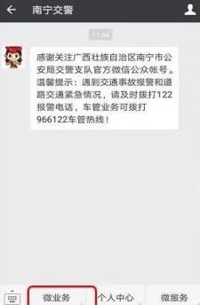 1.关注南宁交警微信微信官方账号,进入“微商”界面。