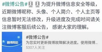 与此同时,微博正在维护中,用户目前不能修改头像、缩写和昵称等信息。