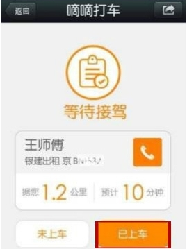 第三步:打车成功后,显示司机姓名、出租车公司、车牌号、位置、预计等待时间等信息。如果司机在一定时间内没有接单,会提示用户下新单。