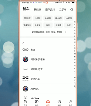 打开手机上的【比特汽车】APP,找到并点击屏幕下方的【选车】