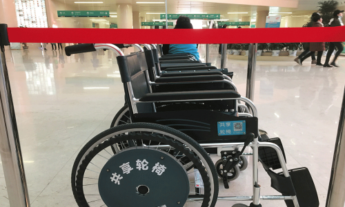 1.医院目前有两个共享轮椅落客点,分别在门诊一楼和急诊大厅,随时为患者提供服务。