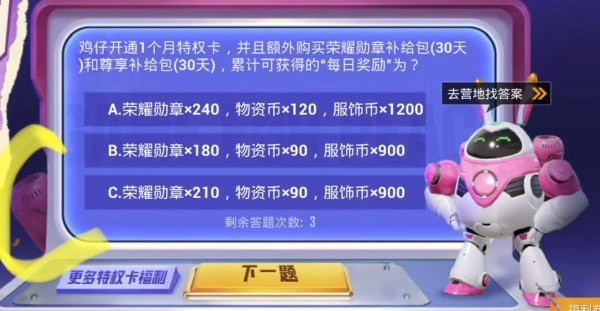 15.鸡开一个月特权卡,额外购买荣誉勋章补给包(30天)和专属补给包(30天)。每天有哪些累计奖励?答案:*210*90*900