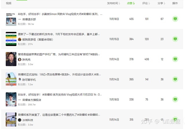 我们以#荣耀80的品牌话题为例,可以看到这个话题有将近一半的赞来自于品牌的自播号发布的视频,头部红人也为话题贡献了大量的曝光和赞。