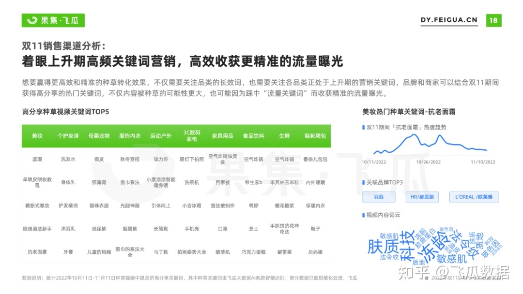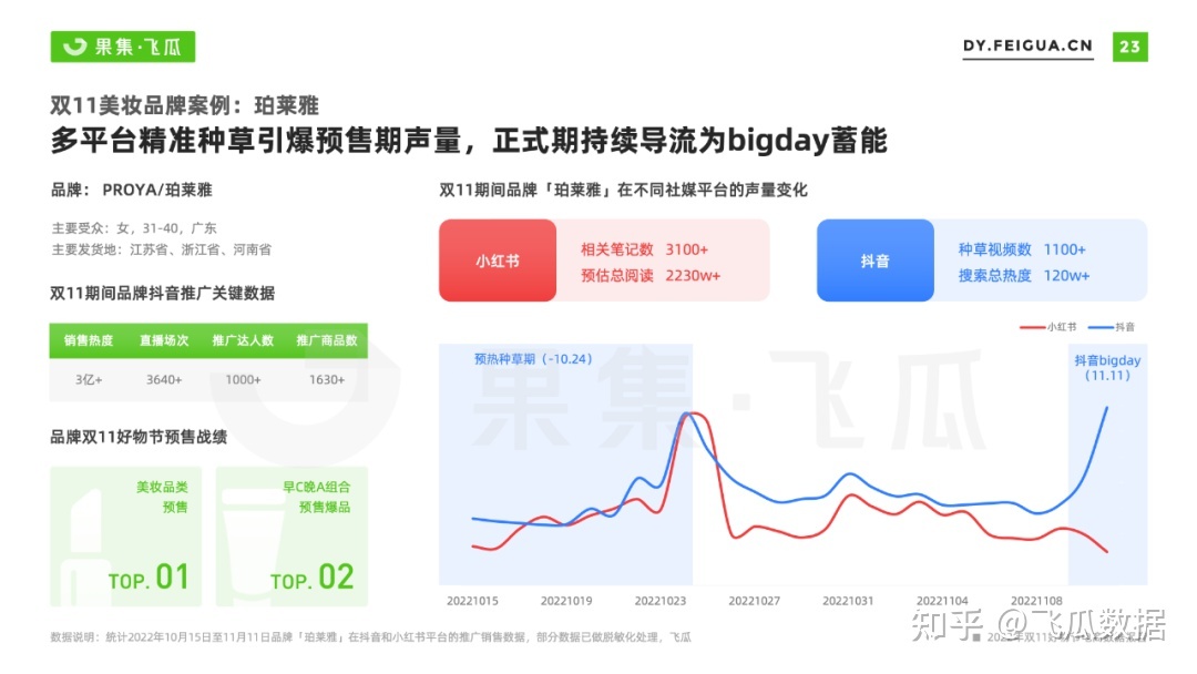 以“珀莱雅”这个品牌为例。据飞瓜透露,该品牌从10月中旬开始在小红书、Tik Tok等平台围绕其明星集提前种草,成功点燃预售期,获得了Tik Tok美妆类目TOP1和早C晚A组合TOP2的预售。