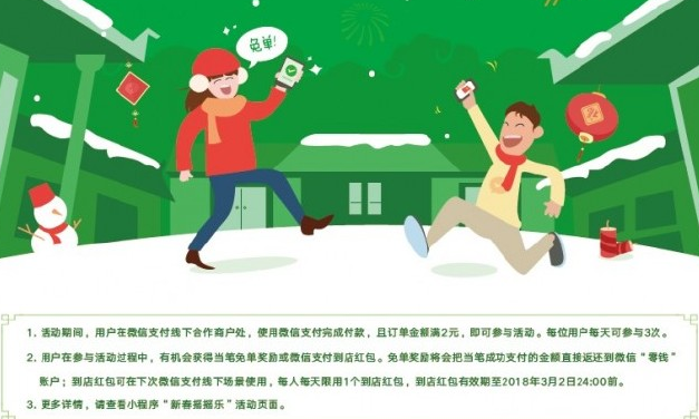 4.在店里的红包,下次可以在微信支付线下的合作商家使用。每人每天限到店一个红包,到店红包有效期至2018年3月2日24: 00。