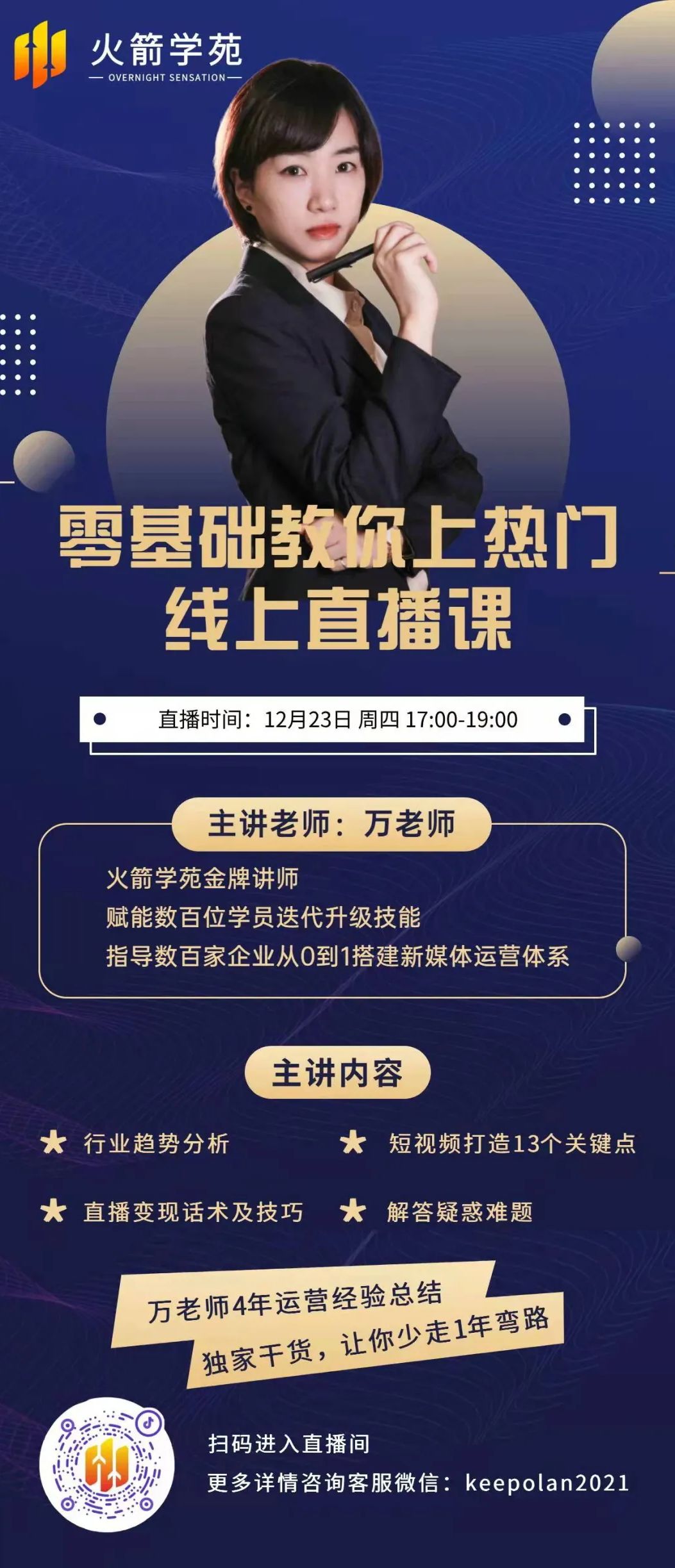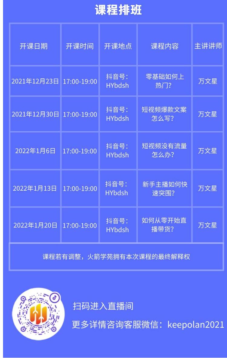 火箭学院是在新媒体运营领域深耕6年的资深“砌砖师”。针对入行较晚或做出成绩的运营人员,年底火箭学院讲师团队精心打磨了“短视频+直播运营系列线上直播课”。