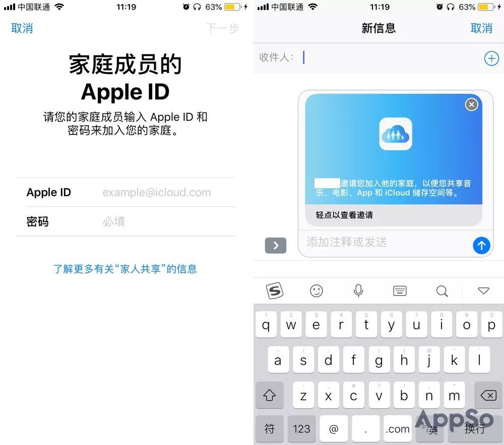 2.添加家庭成员,家庭共享上限6人。将自己用作家庭组织者,您可以直接要求家人填写Apple ID 和密码,也可以通过iMessage 邀请他们。