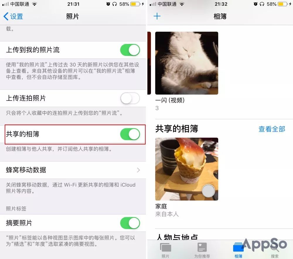 首先,您需要在照片设置中打开“共享相册”,然后添加“家庭共享”。名为“家庭”的共享相册将自动出现在您所有设备上的“照片”应用中。