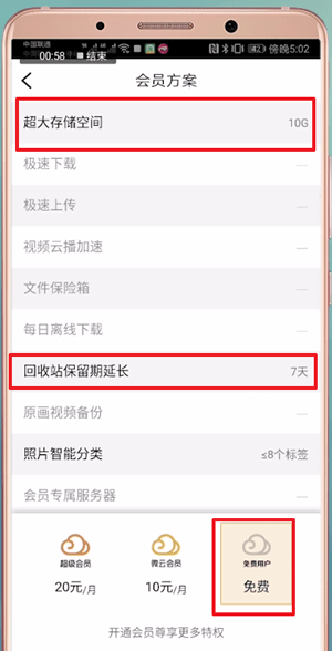 腾讯微云普通用户免费,享受10G免费存储容量、延长回收站保留期7天,以及两项特权:8个标签的照片智能分类;