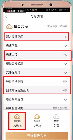 超级会员享受6T存储空间和十项特权,费用为20元/月。到