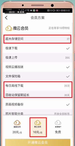 微云会员每月10元即可享受3T存储空间和十项特权;