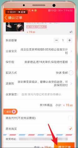 2、点击要购买的商品后显示“有返利”(不代表有返利而是显示优惠券后的商品价格,金币会返还),会自动跳转到淘宝页面,点击【提交订单】下单并付款;