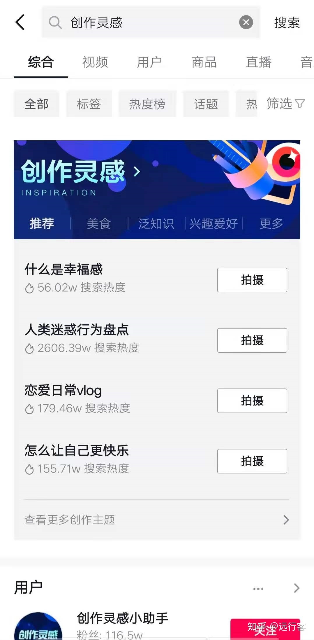 在搜索框里搜索创作灵感,你会看到很多实用的热门话题已经推荐给你了,都是根据你的账号标签个性化定制的。在推荐的右侧,你还可以选择其他各种类型视频的热门话题,找到一个和你的账号定位相关的话题,点进去就知道同类型的账号是怎么创建的了。